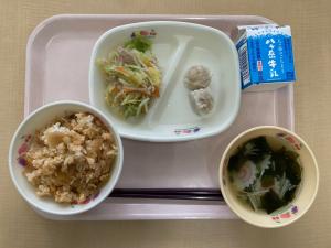今日は「まごわやさしい給食」です。「まごわやさしい」とは、栄養バランスを整えるために食事に取り入れたい、7つの食材の頭文字からとった言葉です。「ま」はまめ・「ご」はごまなど種実類・「わ」はわかめなど海藻類・「や」はやさい・「さ」はさかな・「し」はしいたけなどきのこ類・「い」はいも類です。今年度も給食では毎月取り入れていきます。